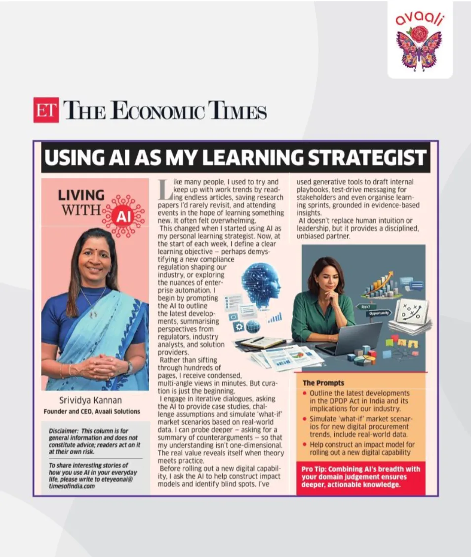Our Founder and CEO Srividya Kannan shares how she uses AI as a personal learning strategist - from stress-testing new compliance frameworks to building impact models before rolling out digital capabilities - in The Economic Times' "Living with AI" column.